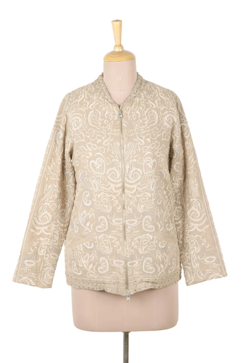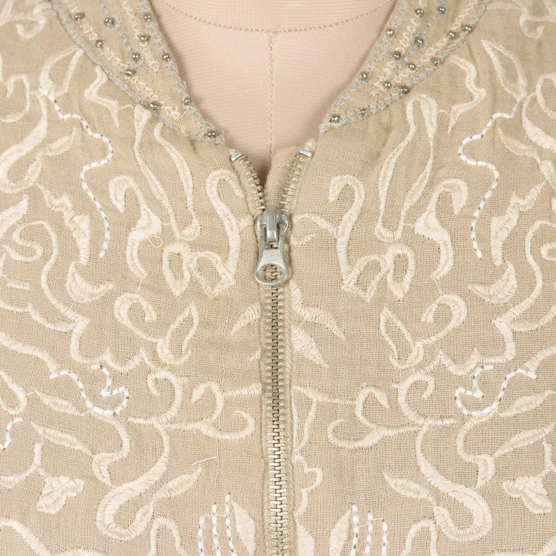 Backed by our 100% Happiness GuaranteeThis casual bomber-style jacket features all-over embroidery in neutral tones on soft cotton muslin. With a zip front closure and angled slash pockets, its' an easy-to-wear, multi-season jacket. Designed by Anchal Ahuja and crafted in India, the jacket is fully lined with cotton and features delicate metallic beads along the flat collar neckline.