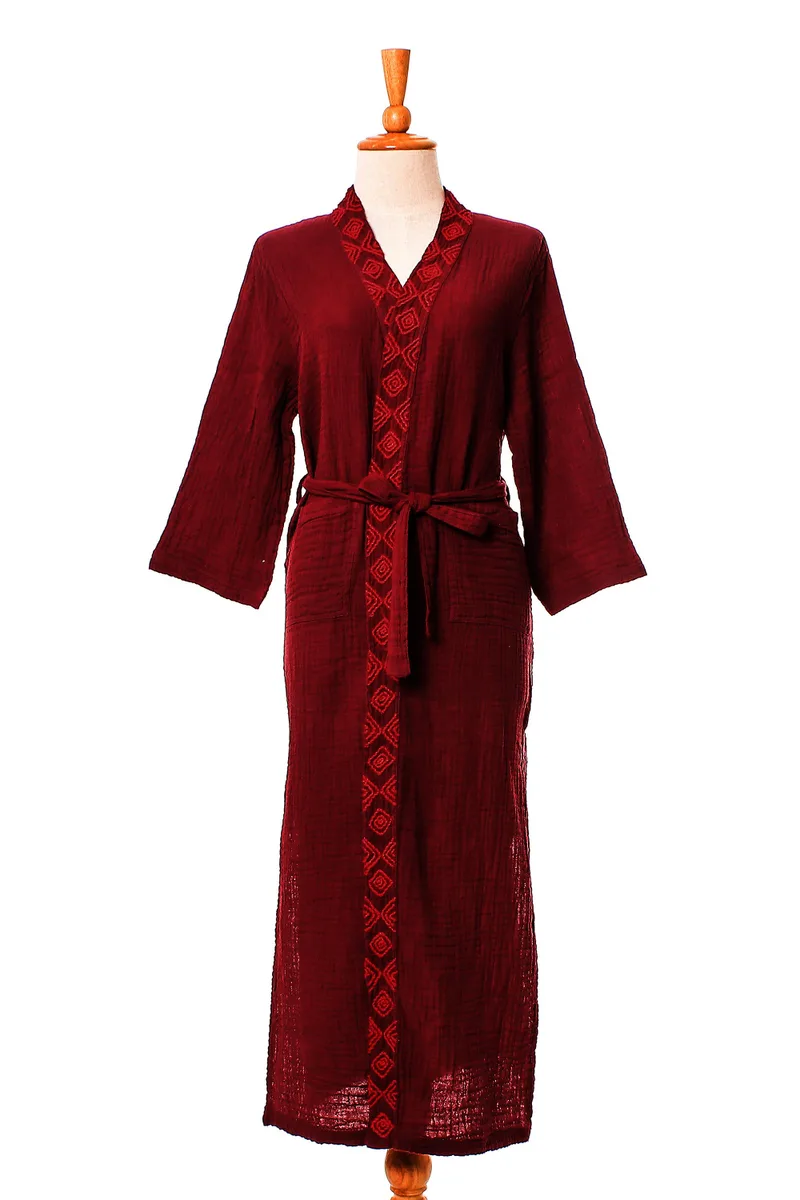 Who doesn't love a relaxing sangria? Working with the cerise and strawberry colors of your favorite drink, Thai artisans create this elegant robe. Woven from cotton to create a ruched texture, this robe is presented by Ying and Joy. Diamond patterns are embroidered by hand along the front hem of this robe, which features two front pockets and a tie belt.