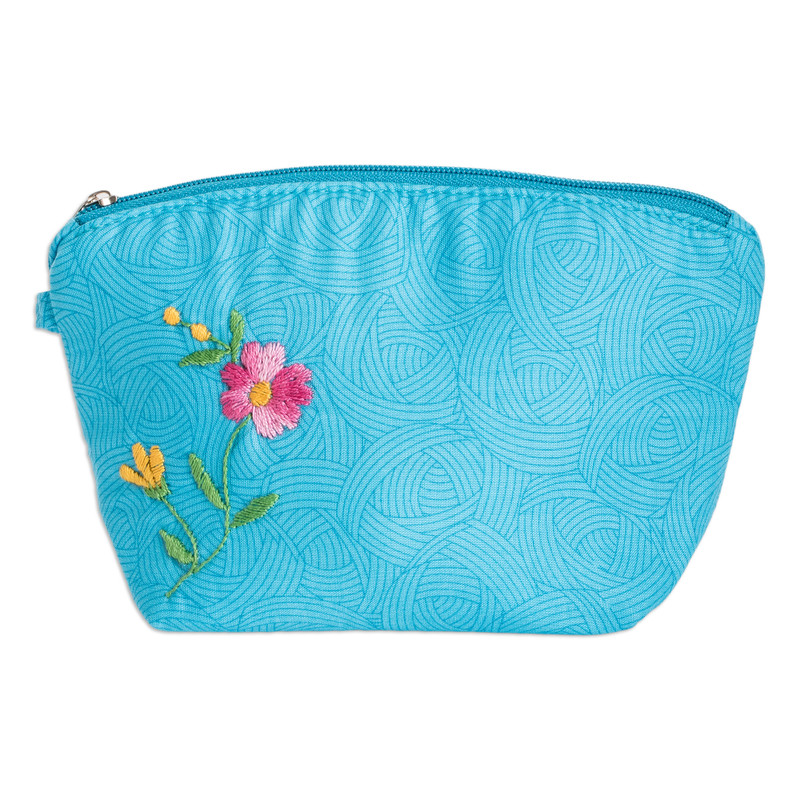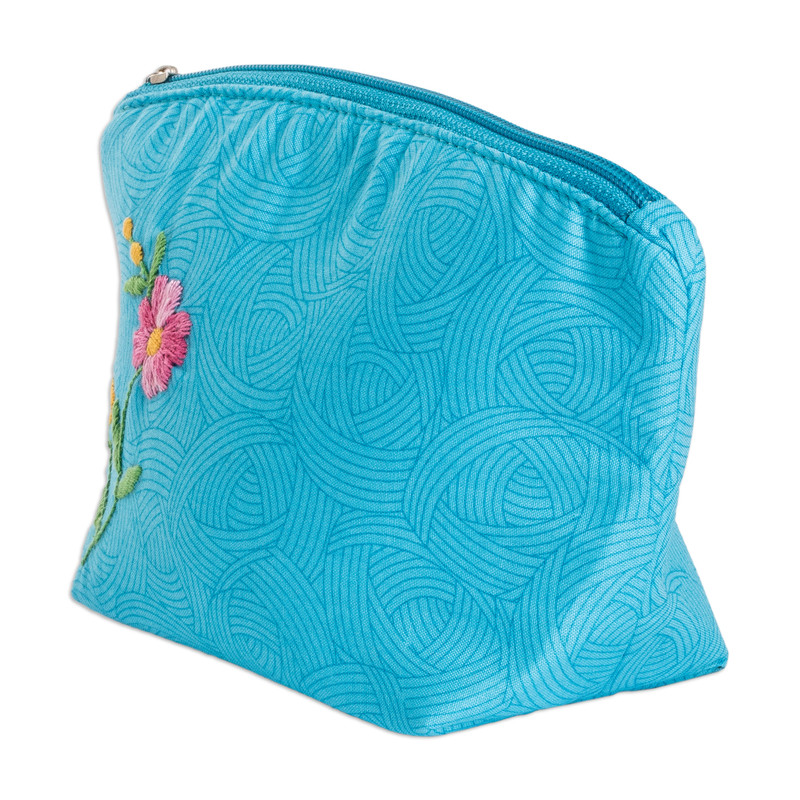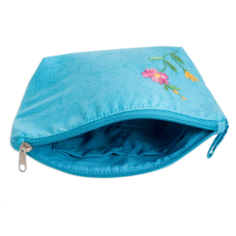 You can find our embroidered cotton cosmetic bag 'Cyan Beauty' by Sonia Solís in handbags categories such as Floral Handbags, Travel Friendly Handbags, Geometric Handbags, Cotton Handbags and Cosmetic Bags Handbags. Enjoy exploring these sections for other Novica treasures.