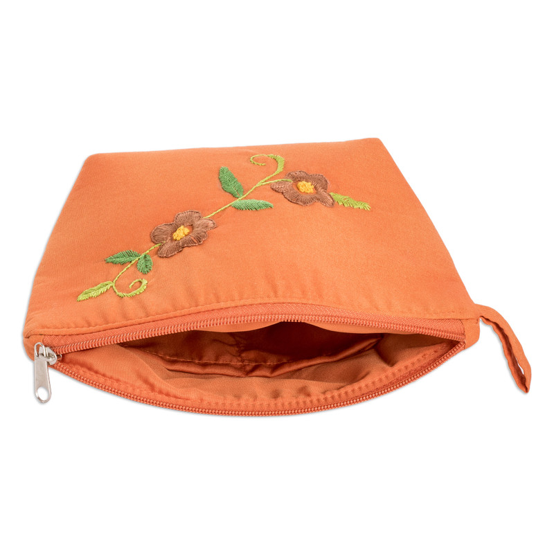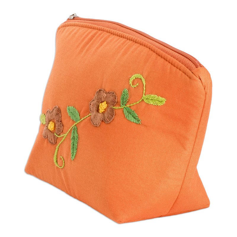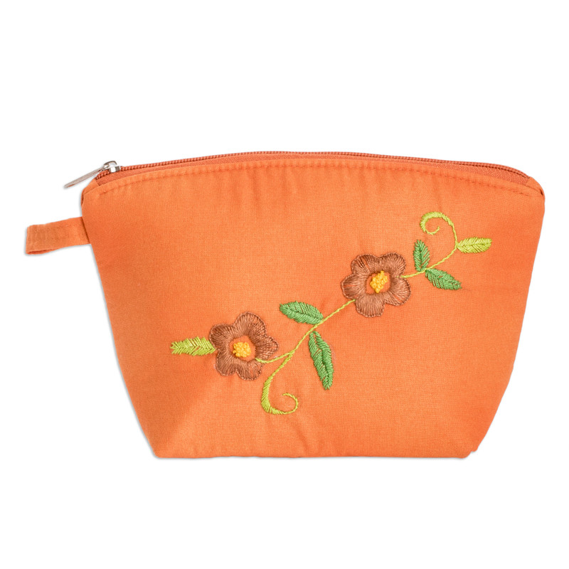 Delivery EstimateEvoking the warm colors of a serene evening, this cotton cosmetic bag by Costa Rica's Sonia Solís is a charming accessory aimed at keeping your makeup tools and personal items neat. The artisan chooses a pretty orange tone to embellish her whole creation, later adding embroidered floral motifs. The design comes with a zipper closure and a little strap on the side, and the interior is lined with cotton and equipped with two open-top pockets for a handy touch.