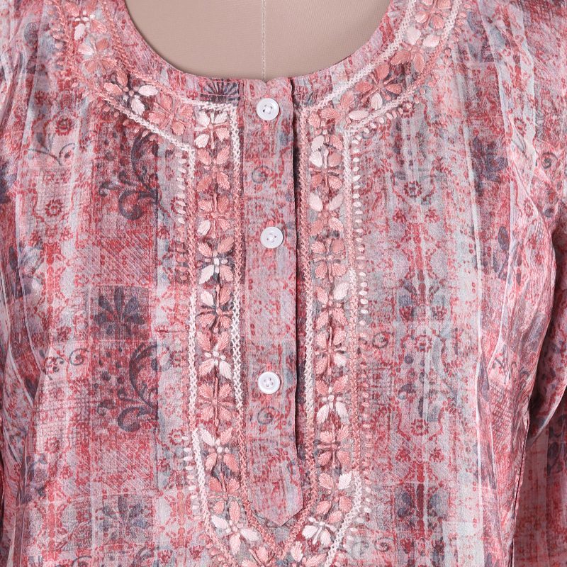 Intricate flower and vine patterns inspired by 19th-century textiles grace this petal-pink tunic. The designs are digitally printed to evoke the well-loved look of heirloom weavings. Cotton embroidery along the button neckline are a nod to the exquisite chikankari embroidery work of artisan Shalabh's hometown of Lucknow.