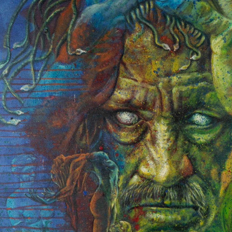 The legends tell of a woman whose gaze turned humans into stone, becoming a symbol of misfortune and disgrace. For Balinese artist Aricadia, the new Medusa is an old man whose life is marked by the accumulation of evil energies obtained through evil decisions. Made in a palette of green and blue, this expressionist composition portrays the male Medusa in his lifetime of sorrow.