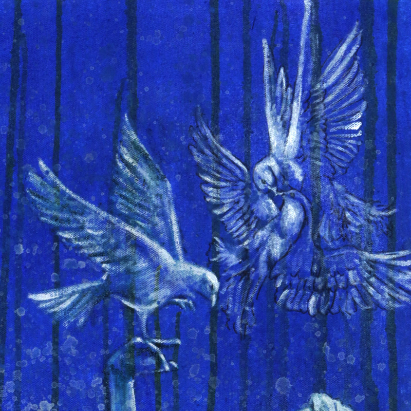 Balinese artisan Aricadia paints an intriguing portrait of an expectant mother surrounded by gentle white doves, a symbol of peace. "Blue represents the sky and yellow is the grain of wheat that grows in the ground. All move as desired, without pollution and war. All went as desired without pollution and war. Just like the doves that welcome him where all babies will be born with cries of happiness, not sadness.
