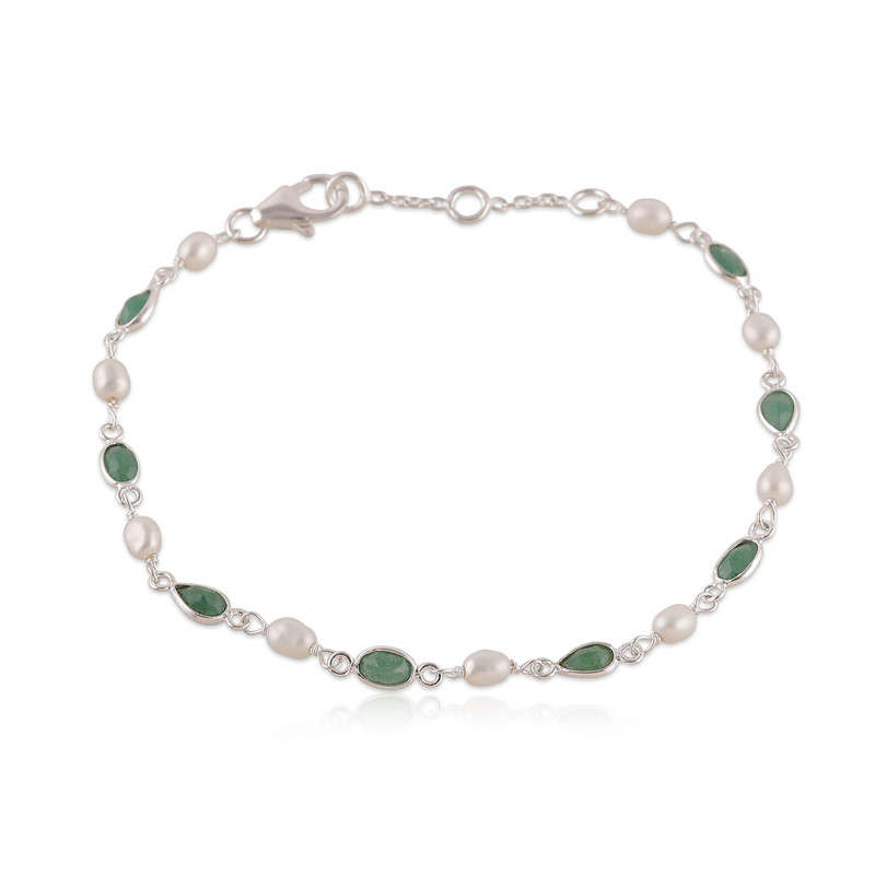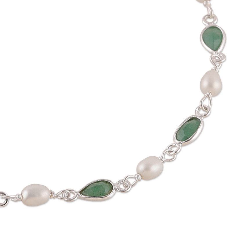 Waves of prosperous beauty arrive from India in the shape of a gorgeous link bracelet—infused with Neetu Barathi's characteristic touch. Sterling silver holds aventurine gems and cultured pearls together, creating a chain of green and cream sparks to represent the ocean's good fortune.