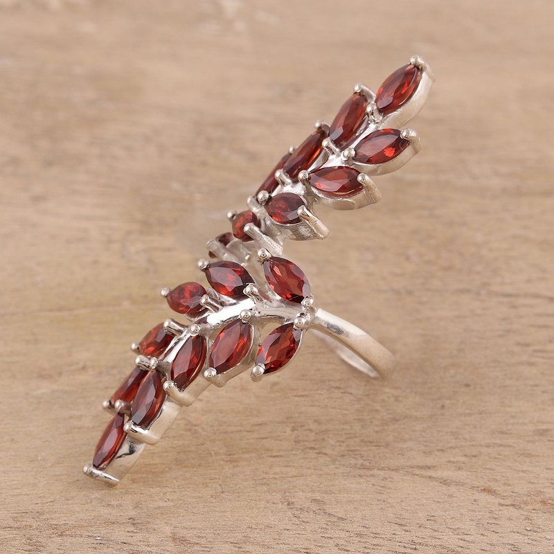 Wrap yourself in dazzling garnets with this gorgeous ring from India's Alok Jain. Over five carats of marquise-cut faceted garnets form exquisite leaves on sterling silver branches. The wrap ring's shimmering scarlet foliage whispers of the approaching winter.