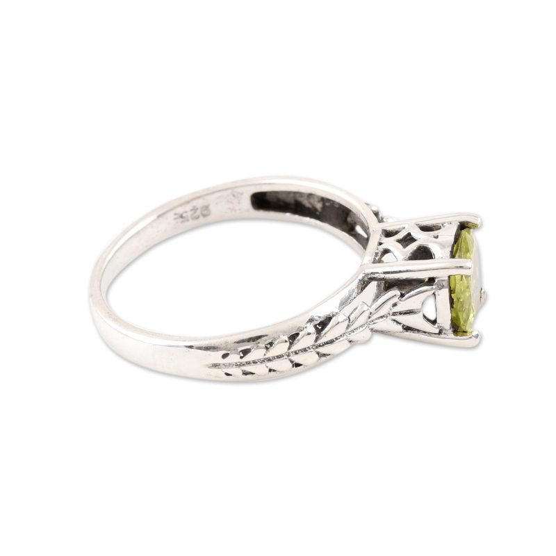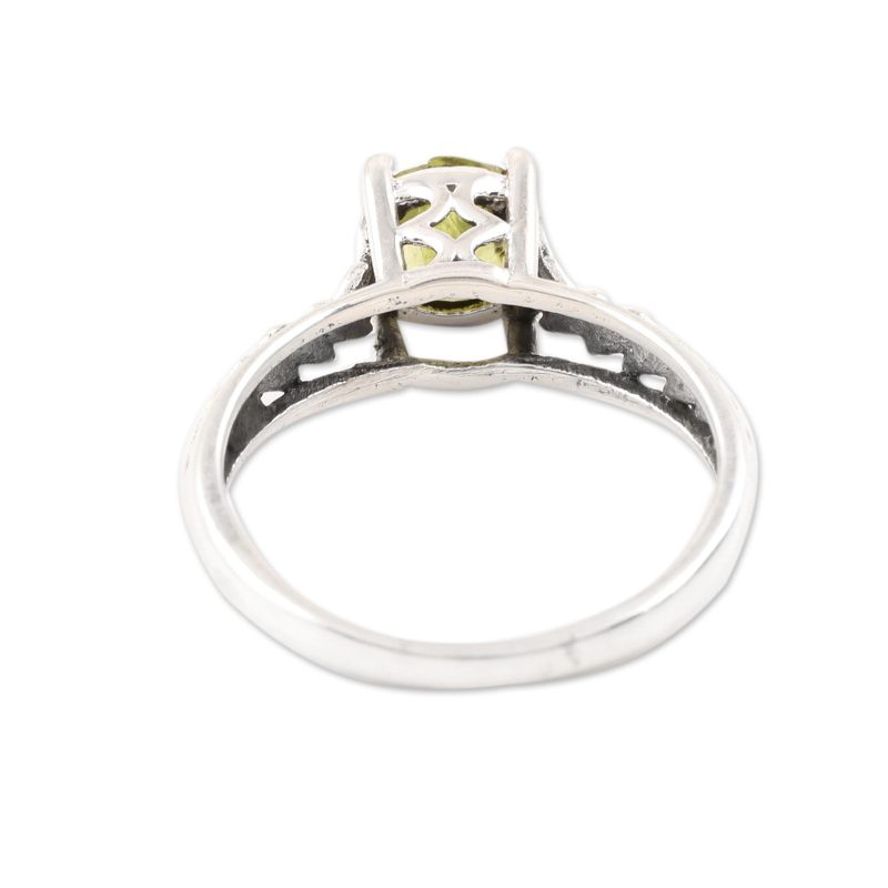 Sparkling with lovely facets, a one-carat peridot gem crowns this solitaire ring from India. Rakesh Rana creates this ring, which circles the finger with a patterned band of sterling silver.