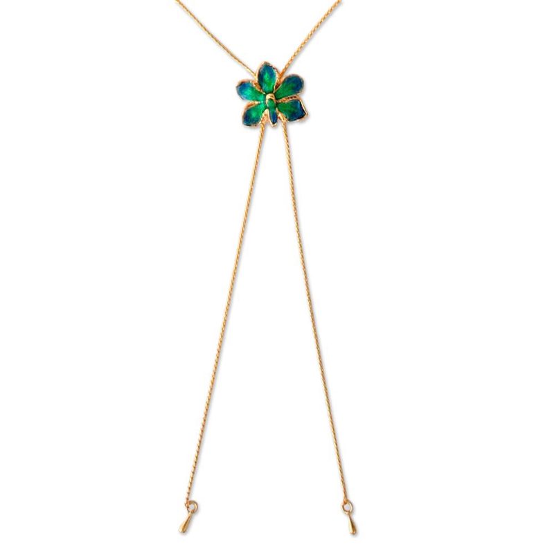 Preserved in 24k gold, a natural blossom reveals exuberant colors enameled by hand. Danai selects a perfect flower for this pendant, showcasing the classic Thai flower. It hangs from an adjustable gold-flashed brass chain.