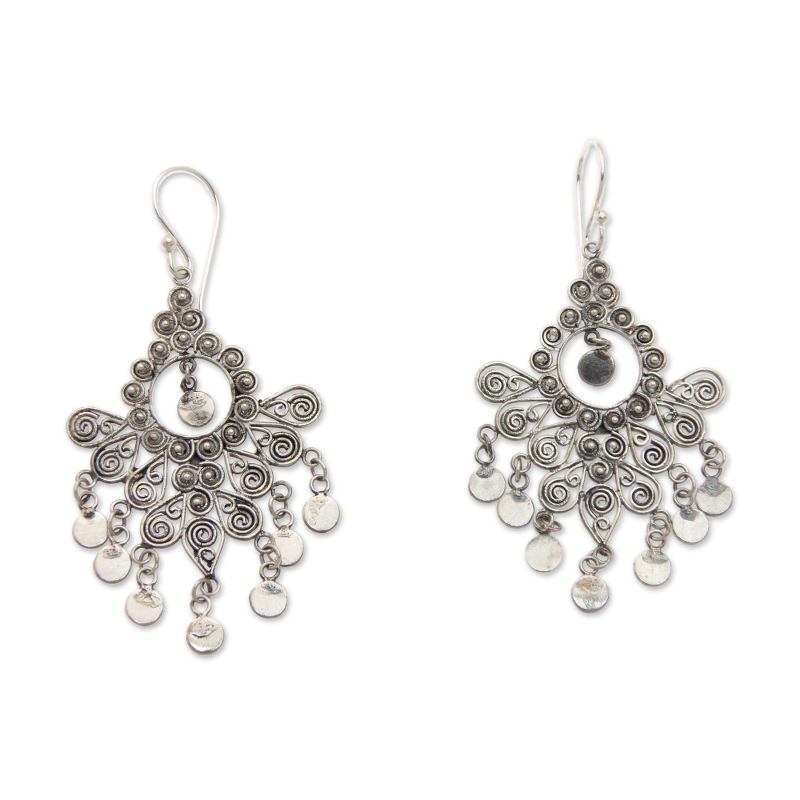 Spreading outward in a flamboyant display like a peacock's feather, these chandelier earrings from Bali artisan Desi Antari are every bit as dramatic. Delicate polished paillettes dangle from swirls and spirals, all rendered by hand in sterling silver. An oxidized finish lends the earrings the look of a vintage treasure.