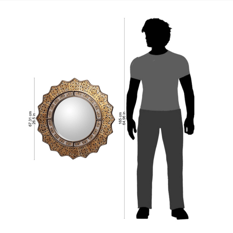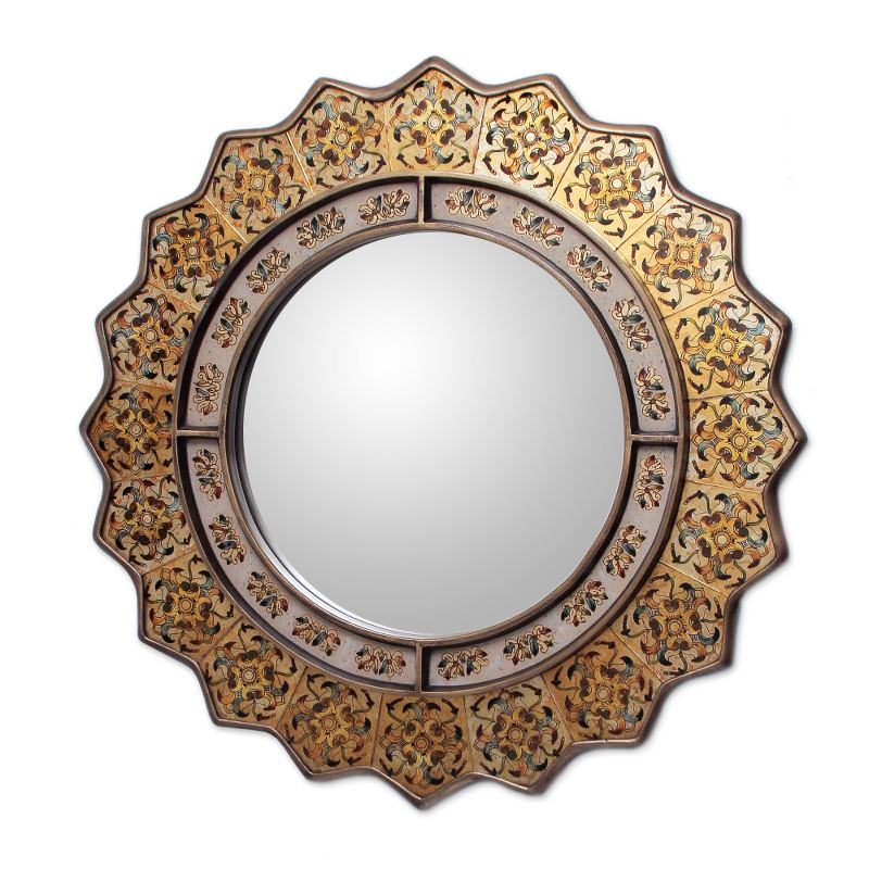 Like a marigold that opens its petals to the sun's warm rays, this mirror reflects beauty in a dazzling way. Asunta Pelaez crafts the frame by hand with traditional painted glass techniques that are unique to Peru's Cajamarca region. Delicately painted, the floral motifs feature golden accents and an antique finish.