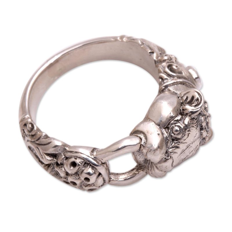 Symbolizing strength to the Balinese, the tiger is a majestic creature of fierce power. Nyoman Rena portrays the great cat in a sterling silver ring. A garnet, the January´s birthstone, centers its forehead.