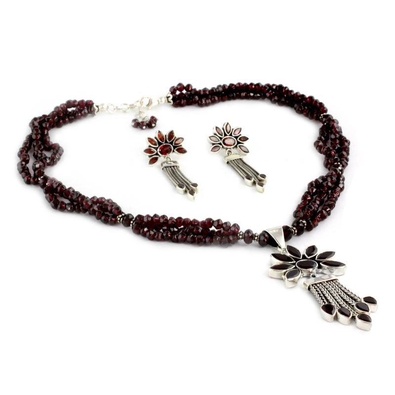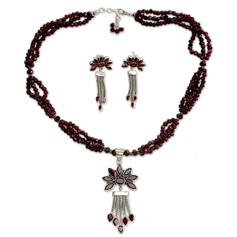 The intense red glow of garnet, the January birthstone, makes each daisy petal glisten with passionate elegance. Neeru Goel's powerful design features faceted garnets safely encased in sterling silver. The jewelry set includes necklace and earrings.