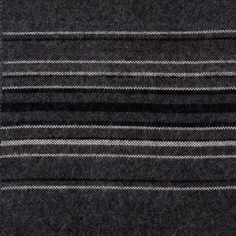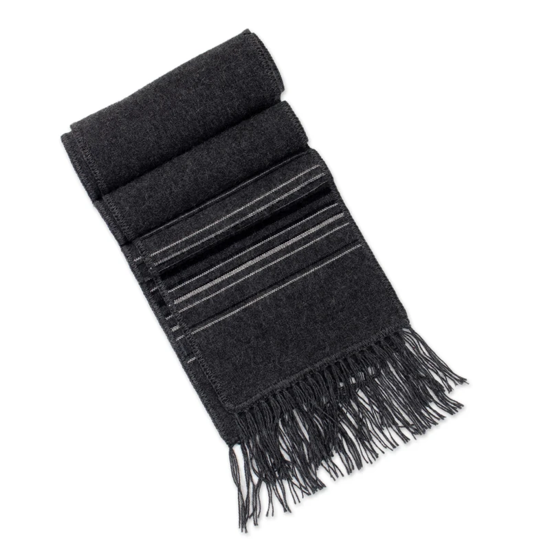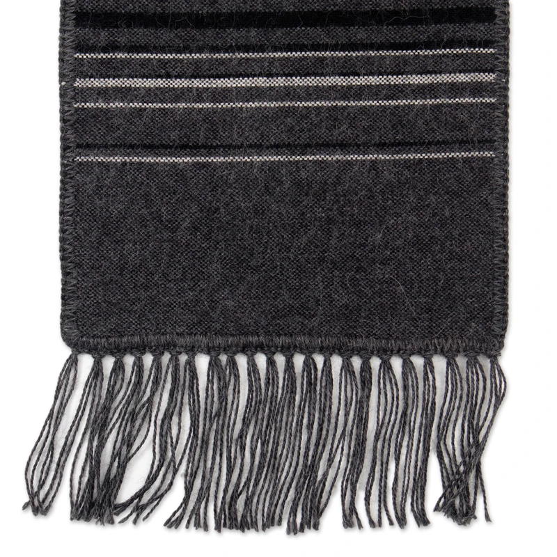 Celinda Jaco selects a cozy blend of Andean alpaca for this handsome men's scarf. Classic in style, it features fine stripes of white and black woven through the dark grey textile. Hand-tied fringe completes a distinguished design.