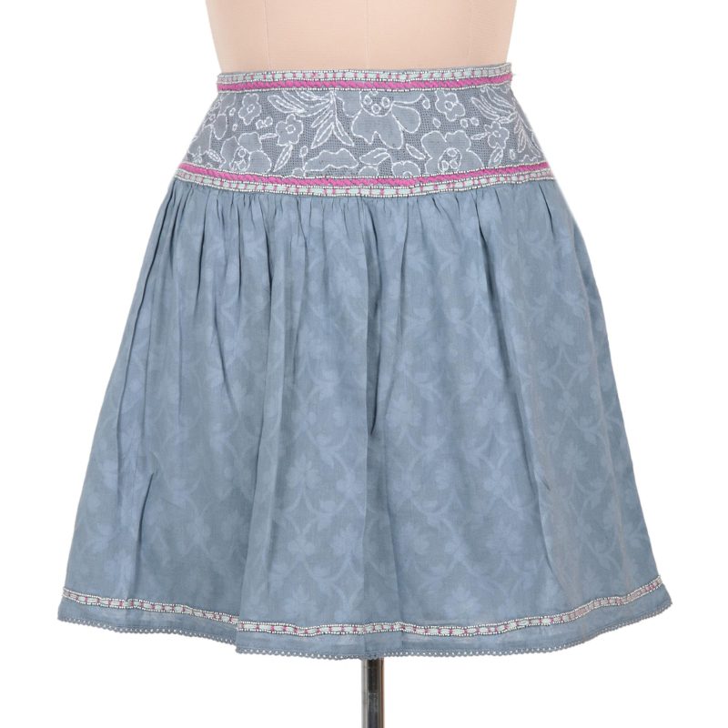 Perfect for any warm-weather occasion, this short skirt by Shashi Seghal is the epitome of feminine. Tone-on-tone printed cotton in soft blue is complemented by lacy embroidery in pale aqua and fuchsia. Graceful pleats fall below the skirt's full yoke, and additional embroidery and lace adorn the hemline. The skirt is fully lined and closes with a zipper.