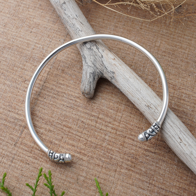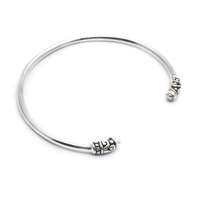 In a testament to the beauty of simplicity, Made Sri designs this pretty cuff bracelet. A plain cuff of polished sterling silver culminates in elegant dot and swirl motifs complemented by dark oxidization. Feminine and discreet, two small cultured white pearls grace the very tips of the cuff.