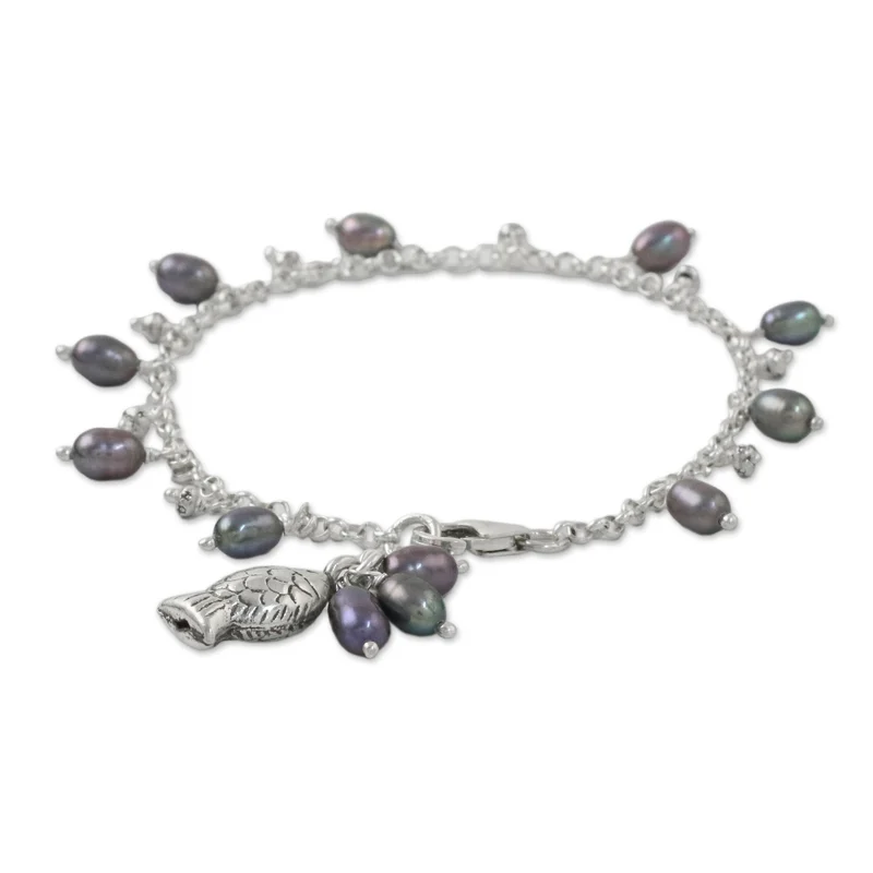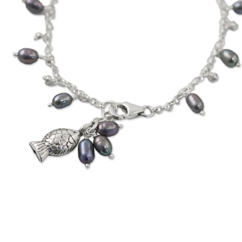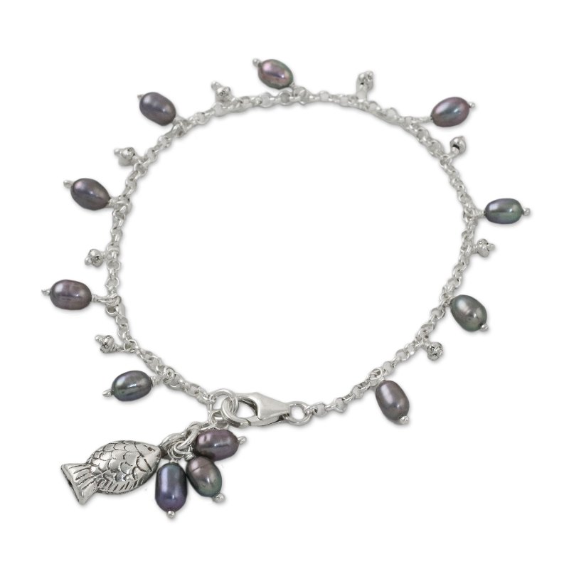 Gleaming with the elegance of Karen hill tribe silver, a cute little fish dangles from this Thai bracelet. A sterling silver chain circles the wrist, accentuated with grey cultured pearl and tiny sterling silver baubles. Withaya Cheunjit presents this lovely accessory.