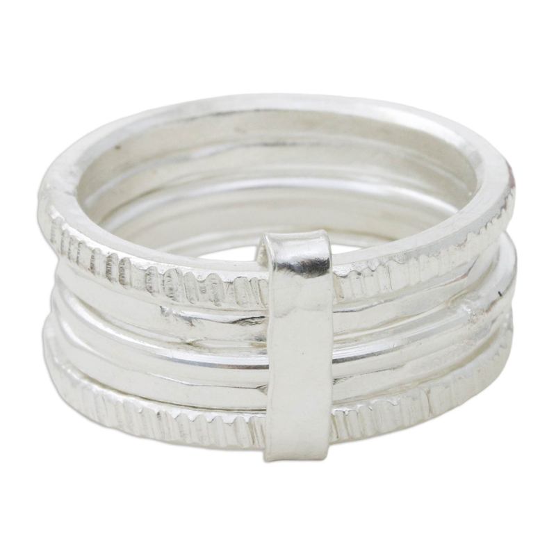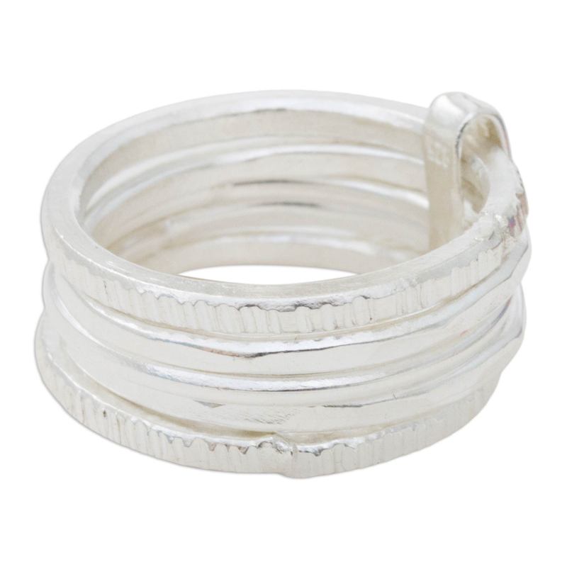 Backed by our 100% Happiness GuaranteeTraditional hill tribe chic permeates this unusual ring from Achara. Crafted by hand, five bands of sterling silver reveal a variety of textures. They are linked into a single ring.
