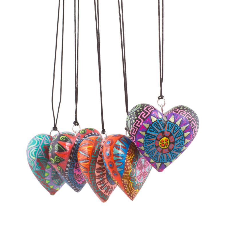 Crafted by hand of Mexican copal wood, five loving hearts are hand-painted with intricate, colorful designs. Working in the time-honored tradition of Oaxaca's alebrije sculptures, Claudio Ojeda creates this set of petite ornaments, perfect for home decor or for hanging on the tree.