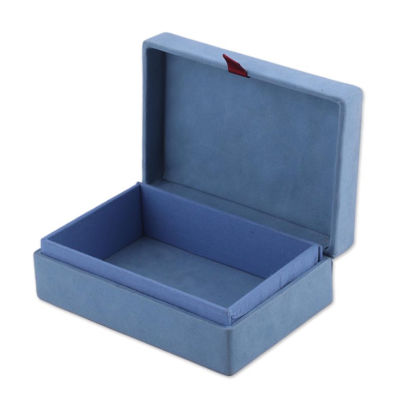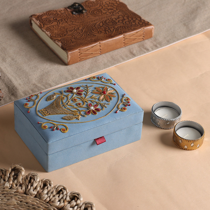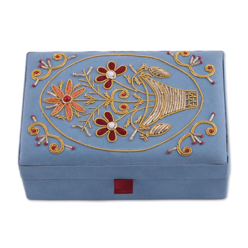 The exterior of this rectangular jewelry box is lined with velvety material in sky blue. The lid features delicate zardozi floral embroidery done with metallic zari thread and beads. Designed by Arti Sharma, the box opens to a single-compartment lined interior.