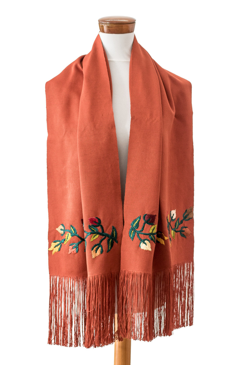 Talented and gifted with an eye for fashion, the artisans from the Life and Hope Women's Association (Asociacion de Mujeres Vida y Esperanza) show Guatemala's exquisite arts in the embroidered details adorning this distinguished shawl. Loomed from cotton, the garment features a gorgeous russet base hue that adds a charming tone to the fringes and floral motifs decorating each end.