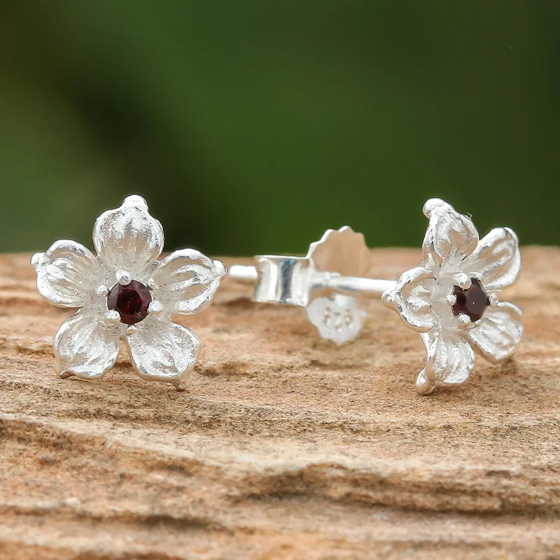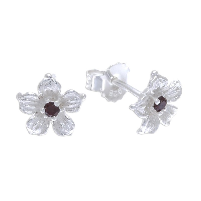 Backed by our Happiness GuaranteeGraceful winter blooms adorn the ears in this pair of stud earrings from Indonesia. Featuring a design by Sarote Lochotinunt, each earring is crafted from sterling silver with a single petite stone of natural garnet in the center.