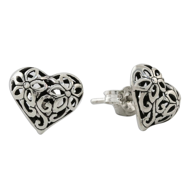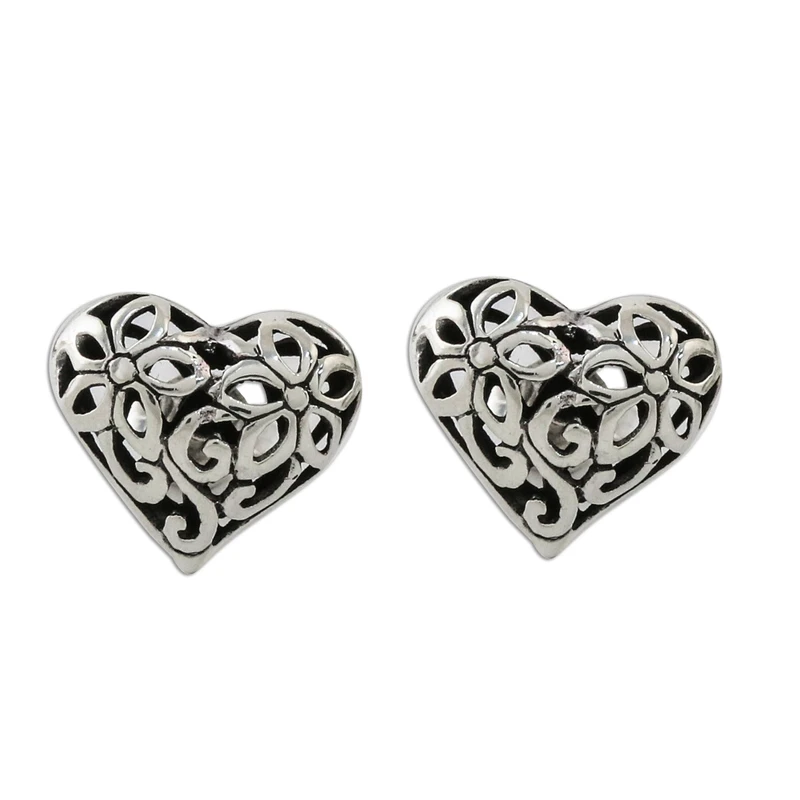 Decorated with elaborate openwork that forms petaled flowers, two hearts are crafted of sterling silver and accentuated with a combination of finishes that catches the eye. Presented by Wadarat Supasirisuk, these stud earrings are a testament to the beauty of Thai handicrafts.
