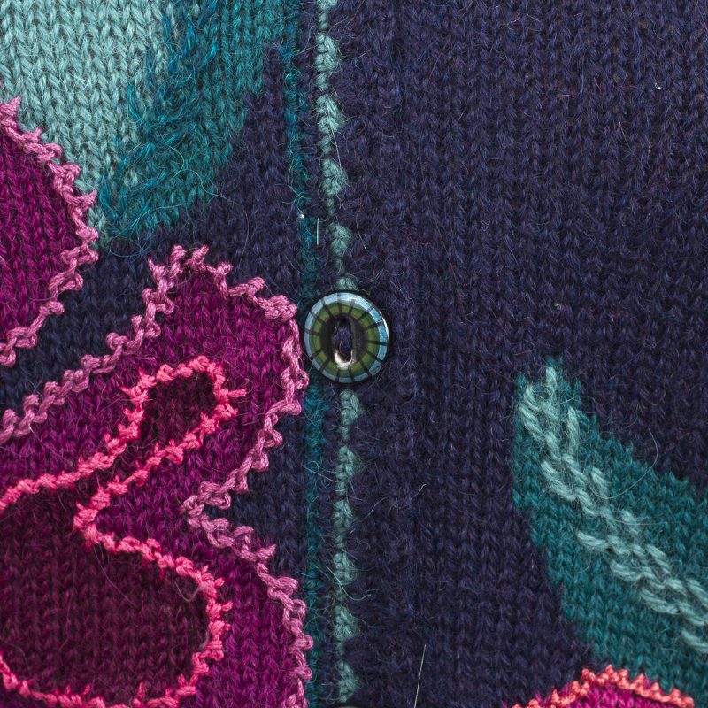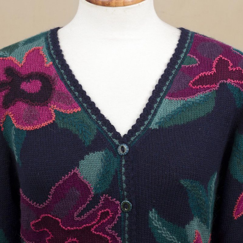 Backed by our 100% Happiness GuaranteeInspired by the flora of the Andes, Maria Cutipa in Peru creates this stunning intarsia knit cardigan sweater. The v-neck sweater is knit of pure alpaca wool in navy, jade and magenta. Hand-crocheted accents add rich texture to the design.