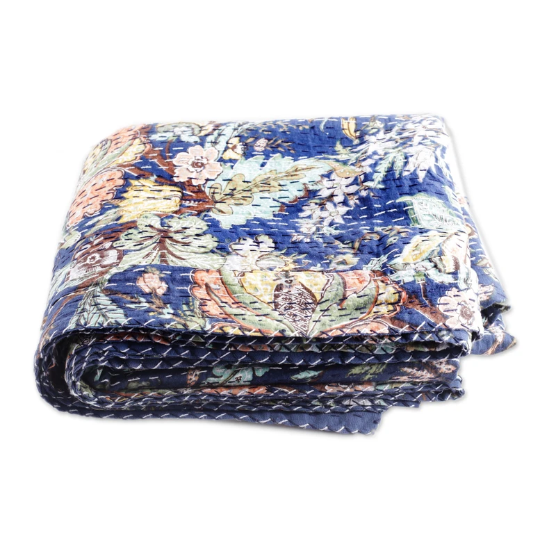 The spring midnights are stunning, just like this cotton bedspread by artisan Anil Khandelwal of India. A lovely floral print rests on an indigo base hue, creating a oneiric aura ideal for a peaceful moment. Kantha embroidered details complete the piece, adding a classic touch.