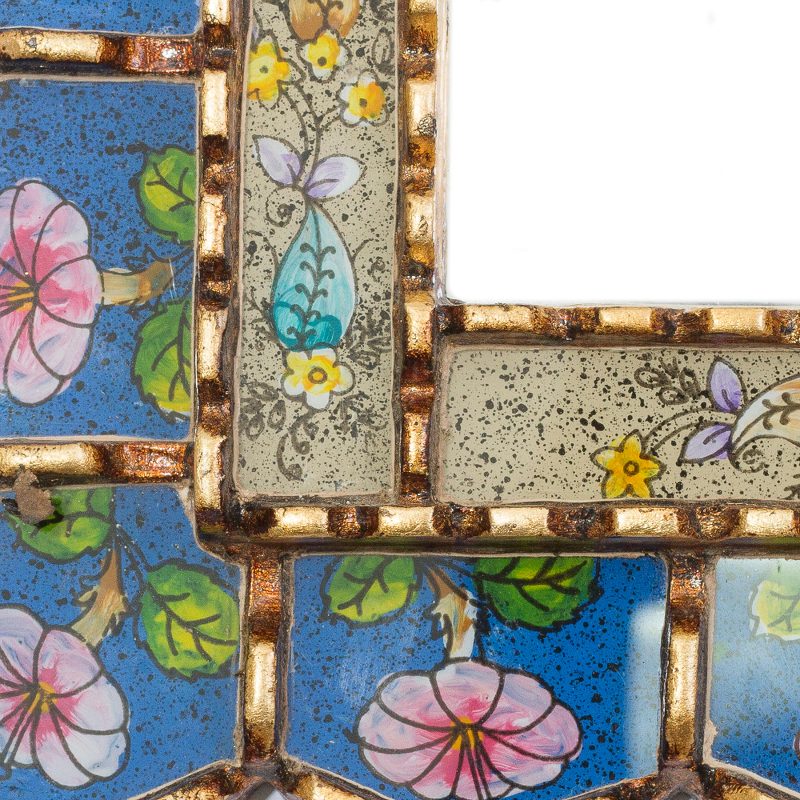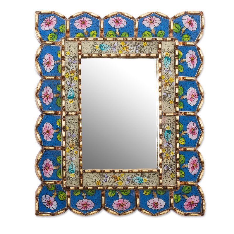 Backed by our 100% Happiness GuaranteePainted by hand in the colonial style of reverse-painted glass, colorful flower motifs frame this rectangular wall mirror from Peru. Gliseria Soto creates this mirror, which is crafted from mohena wood. Bronze leaf is applied over the wood, resulting in a gold-tone finish.