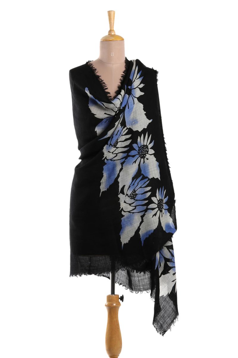 Backed by our 100% Happiness GuaranteeUsing the screen printing technique, Indian artisan Arnab Roy decorates this wondrous wool shawl with blue and white floral motifs against a body of black. The lovely accessory brings the beauty of late night blossoms wherever it goes, completed around the edges with petite fringe work.