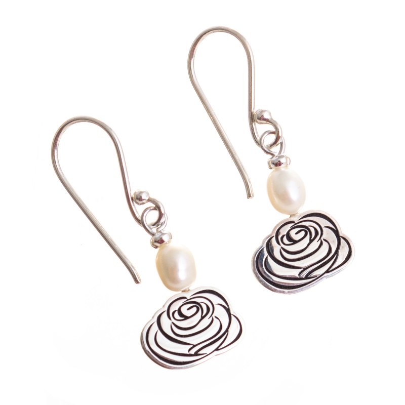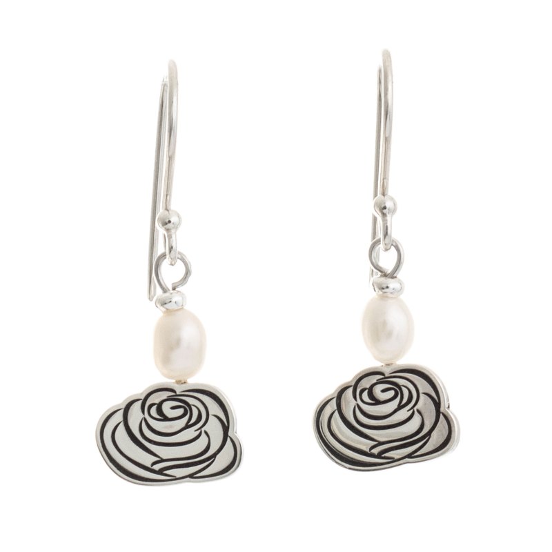 These sweet contemporary dangle earrings are from the workshop of Yan Fredy Bolivia in Peru. The sterling silver rose earrings are crowned with cultured freshwater pearls.