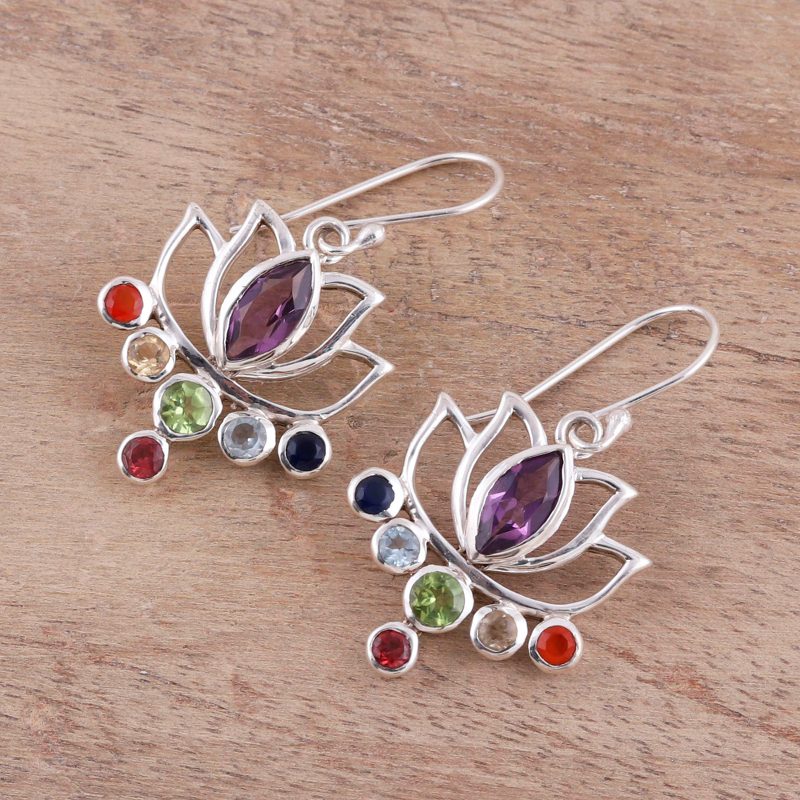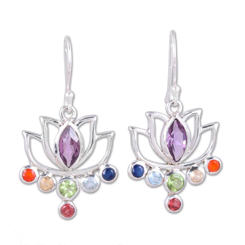 Representing the seven chakras, or energies of the body, faceted gemstones of carnelian, citrine, peridot, blue topaz, sapphire, and garnet accentuate marquise amethysts, totaling 4.5 carats altogether. Chintan presents these Indian dangle earrings, crafted with high-polish sterling silver openwork in the shape of lovely lotus flowers.