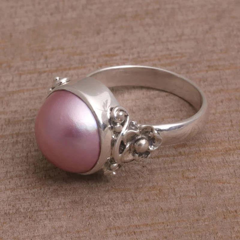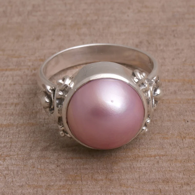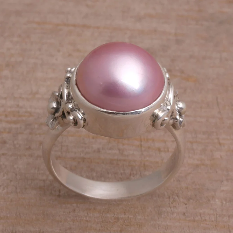 Backed by our 100% Happiness GuaranteeCrowned by an orb of cultured pearl with soft, dyed pink hues, this Balinese cocktail ring brings a sweet beauty wherever it goes. Designed by Buana, the band is handcrafted of sterling silver with jepun, or frangipani flowers that flank the pearl.