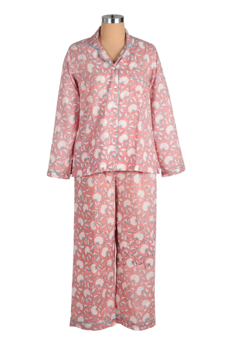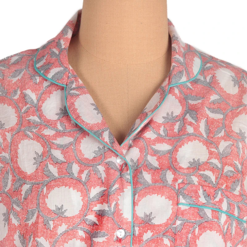 Backed by our 100% Happiness GuaranteeThese lightweight cotton pajamas are a cozy addition to your loungewear wardrobe. Printed with a William Morris inspired pattern in coral and grey, the set is trimmed with a teal piping accent. Featuring a curved notched collar, the blouse is accented with a single breast pocket and the pants have convenient side seam pockets.