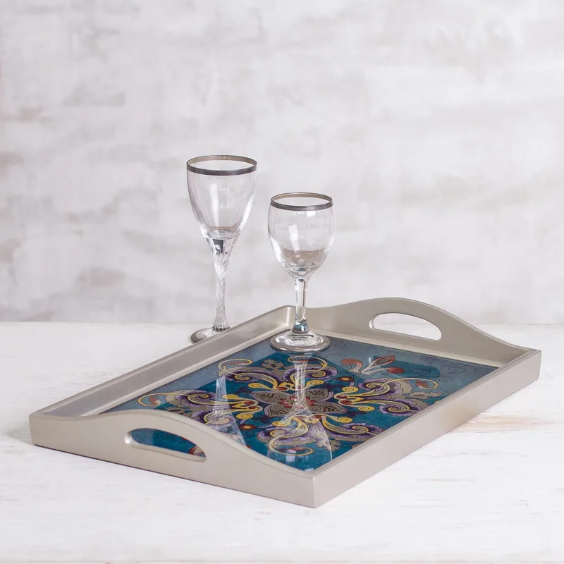Featuring elegant hand-painted floral motifs against a blue background, this Peruvian tray carries on the colonial tradition of reverse-painted glass. Flora Polo creates the tray, which is crafted of wood with silver-toned edges and handles.