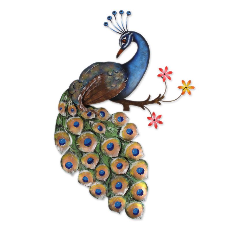 Perched on a floral branch, a majestic peacock adds a touch of beauty to your wall decor. Mexican artisan J. Blas creates this eye-catching wall sculpture, which he crafts from steel sheet. Each of the peacock's feathers is cut and painted by hand, and the peacock's body features a three-dimensional shape.