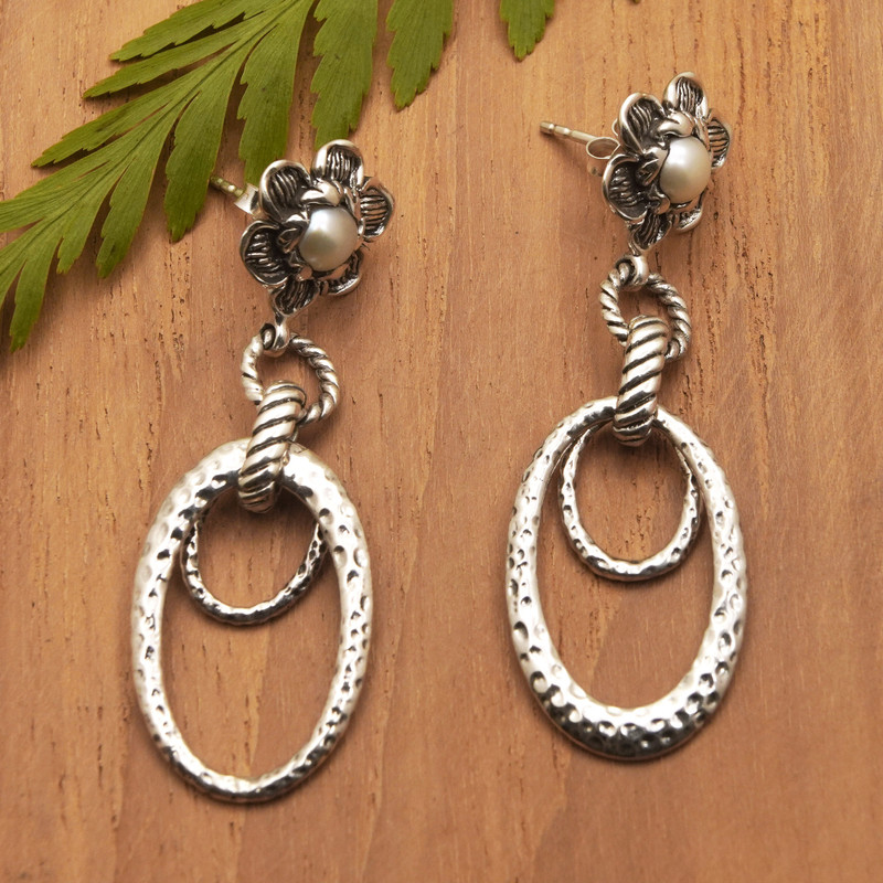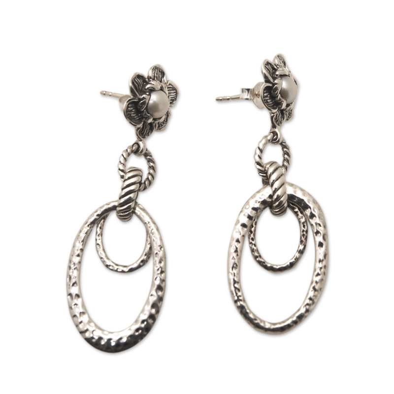 Backed by our Happiness GuaranteeHammered details and spiral accents make this lovely accessory a sublime jewelry piece part of the traditional Balinese art style. Artisan Asri Paramita presents these sterling silver dangle earrings in a polished finish, whose classic style is also enhanced by floral motifs that embrace cultured pearls in a white hue, representing innocence.