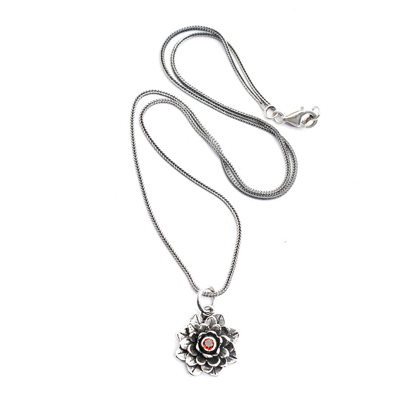 Lovely detailed Lotus flower pendant, beautifully crafted with a garnet in the center. My wife had similar earrings and ring already so she loved this pendant.