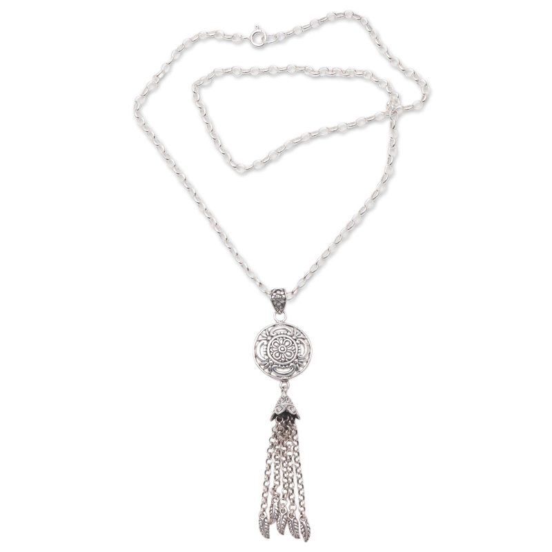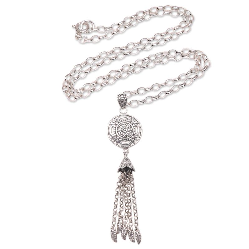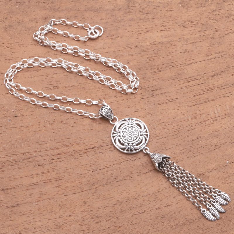 Backed by our 100% Happiness GuaranteeDangling from a "bell" of sterling silver, multiple lengths of sterling rolo chain host petite swinging feathers. Balinese artisan Ari Gunawan designs this pendant necklace, which features a sterling medallion with a floral pattern.