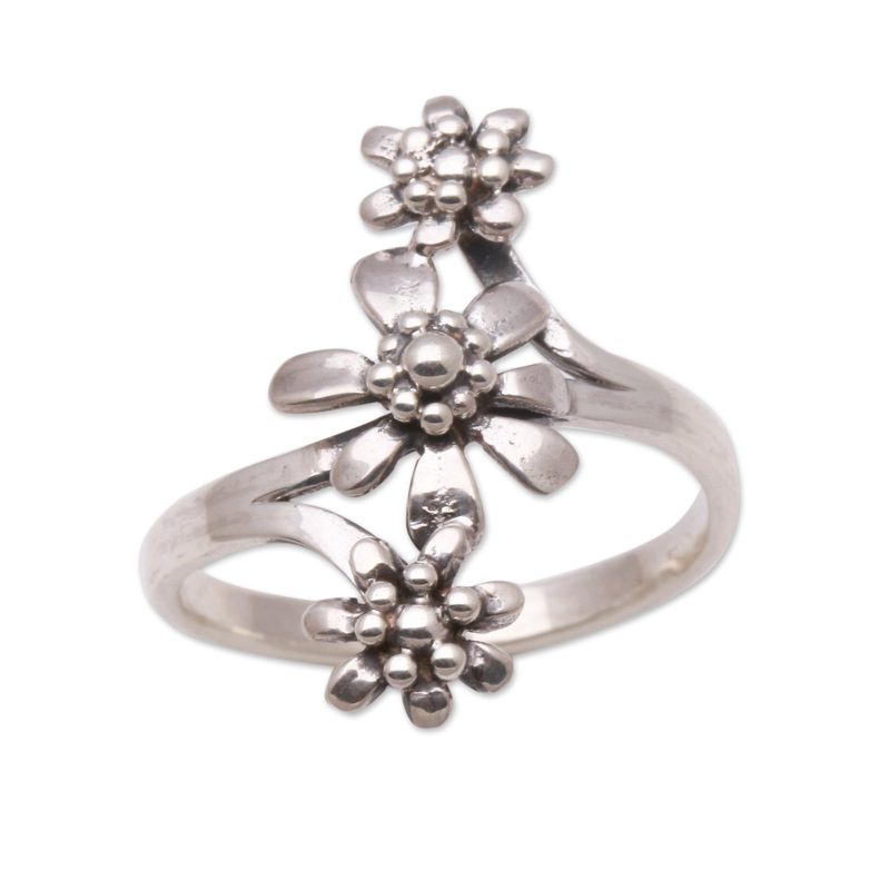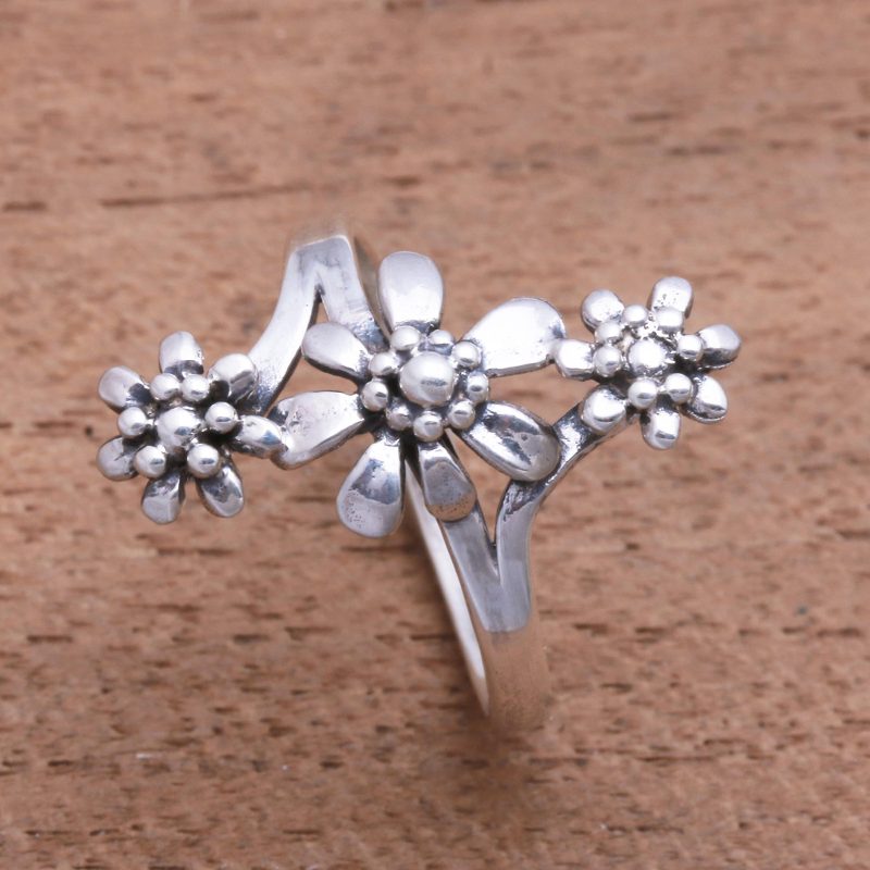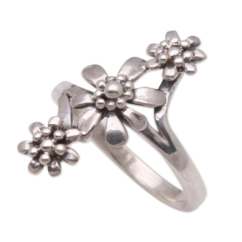 Handcrafted from sterling silver, a trio of flowers forms a bouquet. Designed by Balinese artisan Made Darmada, this cocktail ring circles the finger with a simple sterling band.