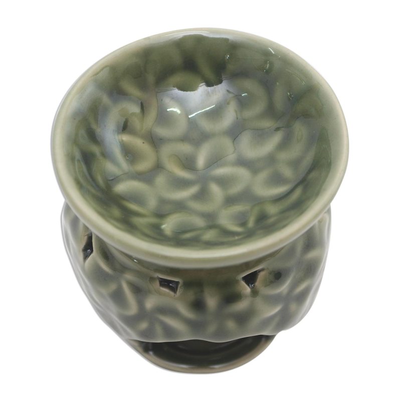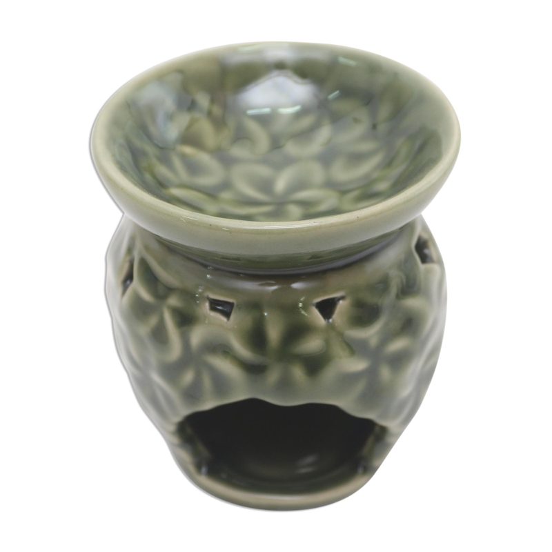 Backed by our 100% Happiness GuaranteeCovered with jepun or frangipani blossoms, this pretty oil warmer will add a tropical vibe and a pleasant fragrance to your home. Dewa Putra creates the oil warmer from green ceramic, with a space for a tealight in the bottom and a bowl to hold fragrant oils at the top.