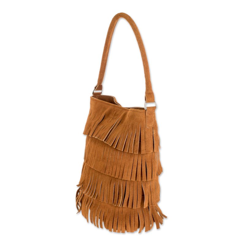 Crafted from suede in a solid ginger hue, this fringed handle handbag is presented by the El Salvador Leather Studio. Opening with a magnetic snap, the bag reveals a suede-lined interior.