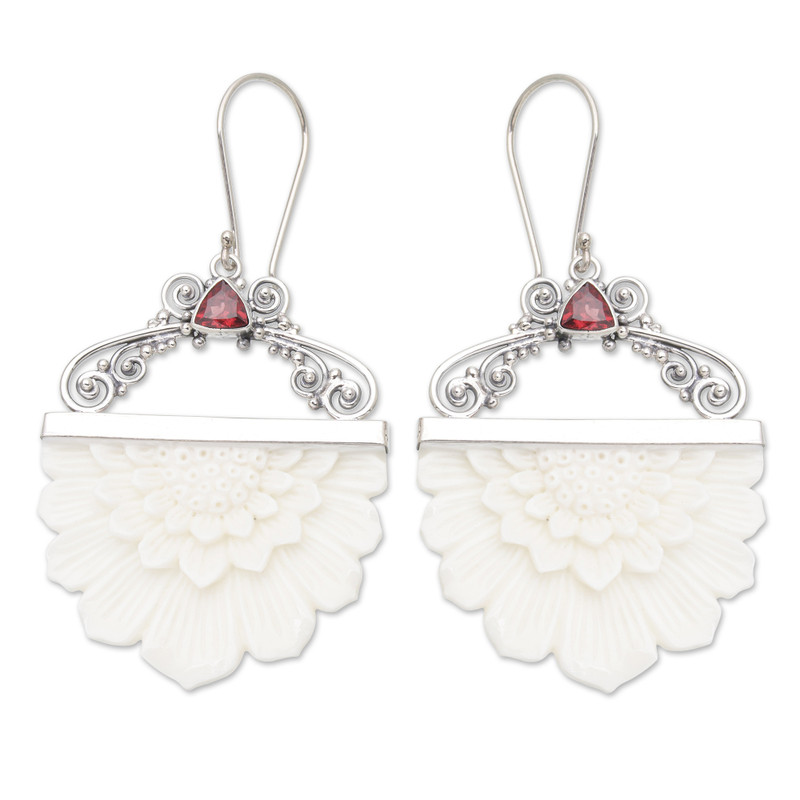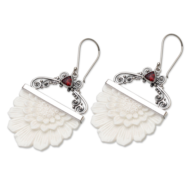 Half a sunflower exquisitely hand-carved from bone swings from a sterling silver hook and connector with intricate details topped by a triangle garnet gem in this splendid pair of dangle earrings. Balinese artisan Ayu Ary designs these stunning earrings with a romantic air to them that makes them charming and stylish at the same time.