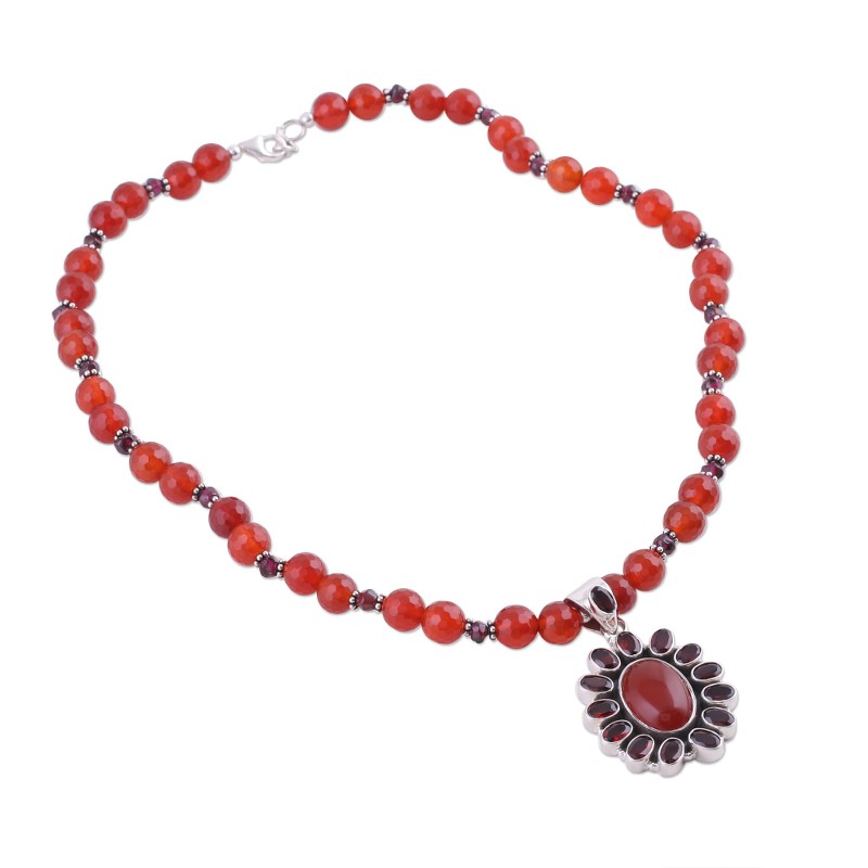 The stone of passion, garnet mingles with carnelian's innate fire. Neeru Goel combines the radiant gems in a necklace of bold drama. Sterling silver complements the stones, intensifying their impact.