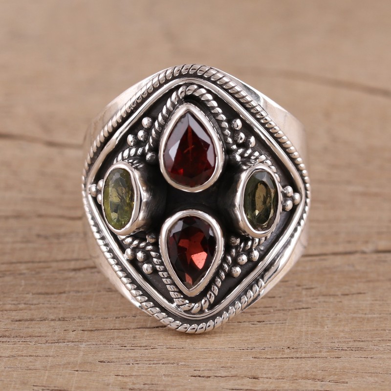 Backed by our 100% Happiness GuaranteeOver one carat of garnet and peridot gemstones achieve perfect harmony, crowning this cocktail ring with a sparkling beauty. Designed by Indian artisan Babun Dey, this ring is crafted by hand of sterling silver, featuring intricate rope and dot motifs that accentuate the stones.