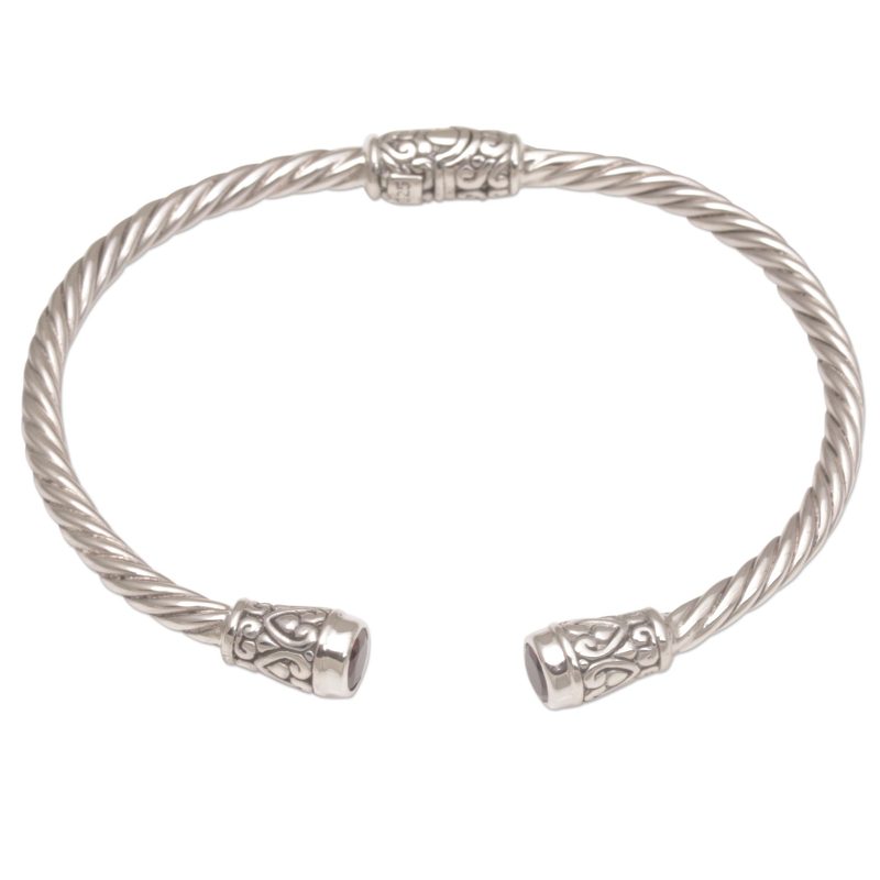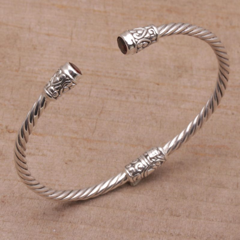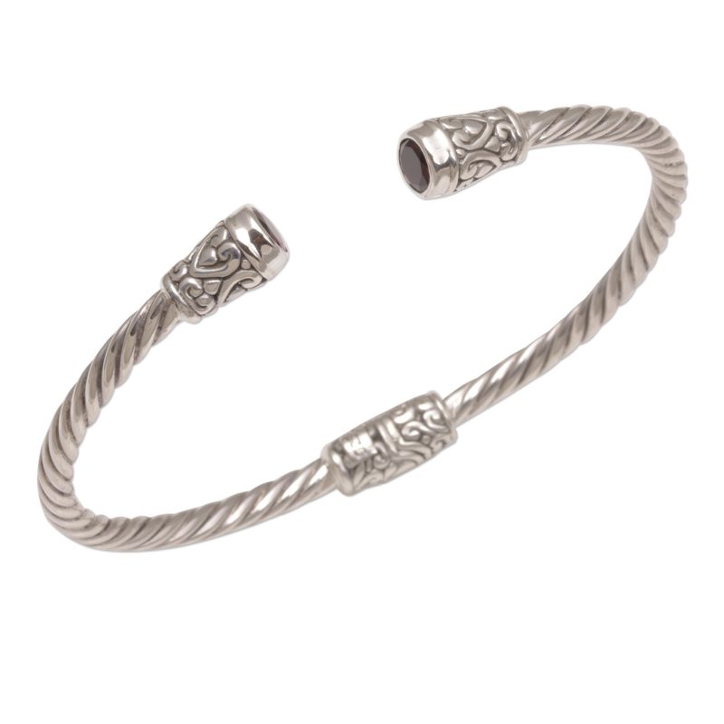 Elegant, spiraling designs in sterling silver circle the wrist. Accented with vine motifs, this cuff bracelet from Bali is designed by Wayan Neri. She caps each end with a faceted stone of natural red garnet, totaling one carat altogether. A concealed hinge at the center opens the bracelet to fit the wrist.