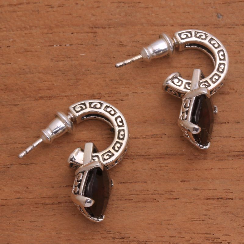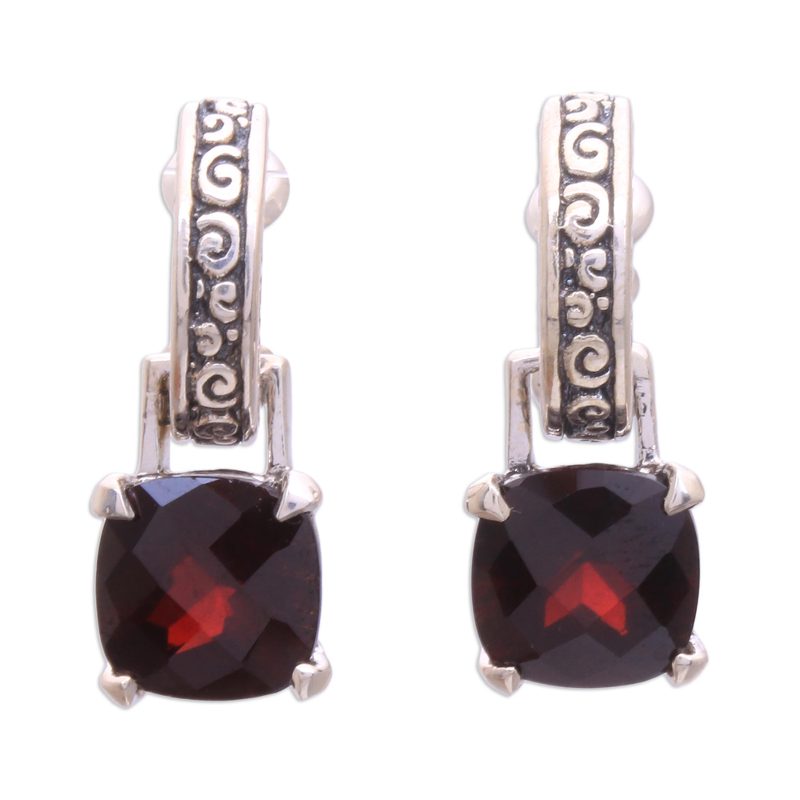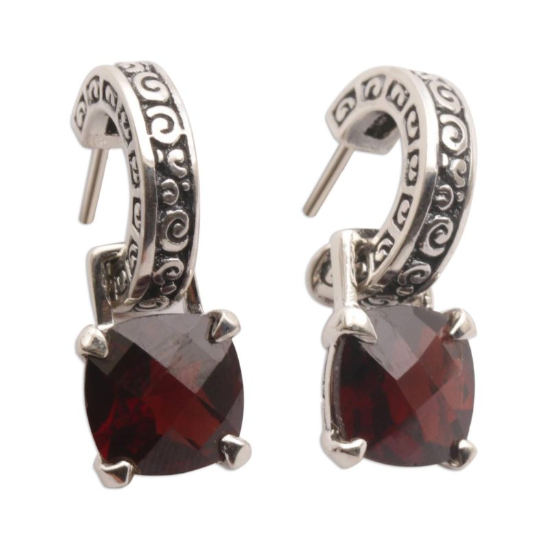 Zayd Makarim of Bali crafts two half-hoops of sterling silver, elaborated with his characteristic "Buddha's curl" motifs. From the elegant hoops dangle five carats of natural red garnet gemstone for a majestic pair of earrings.