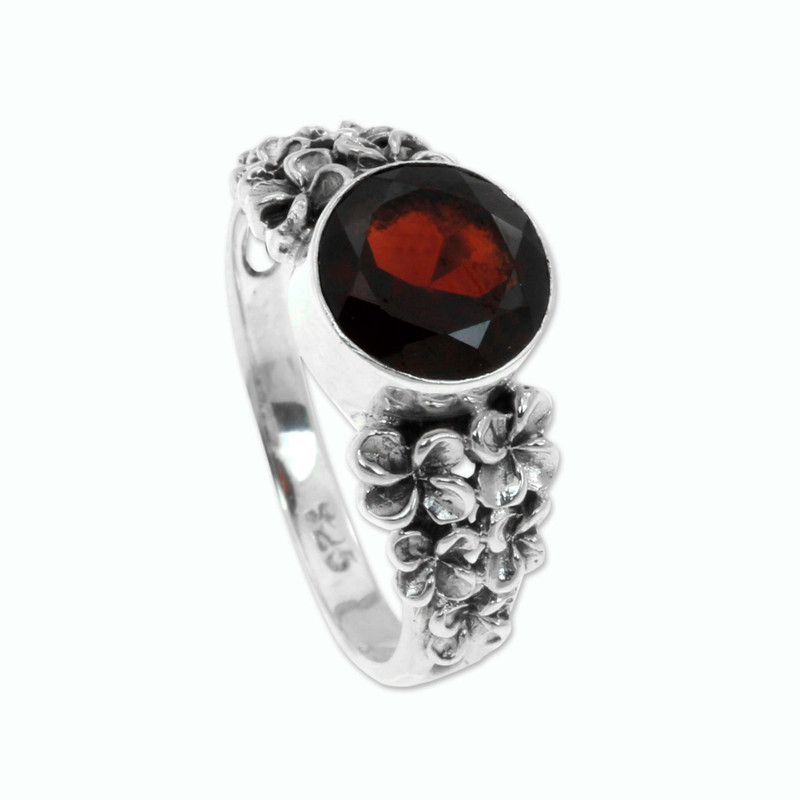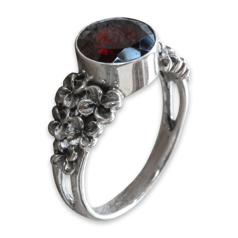 Radiating a crimson glow, a 2.5-carat garnet centers this elegant ring from Bali's Komang Wijayana. He carefully crafts the ring from sterling silver, adding delicate frangipani blossoms to flank the rich red gemstone.