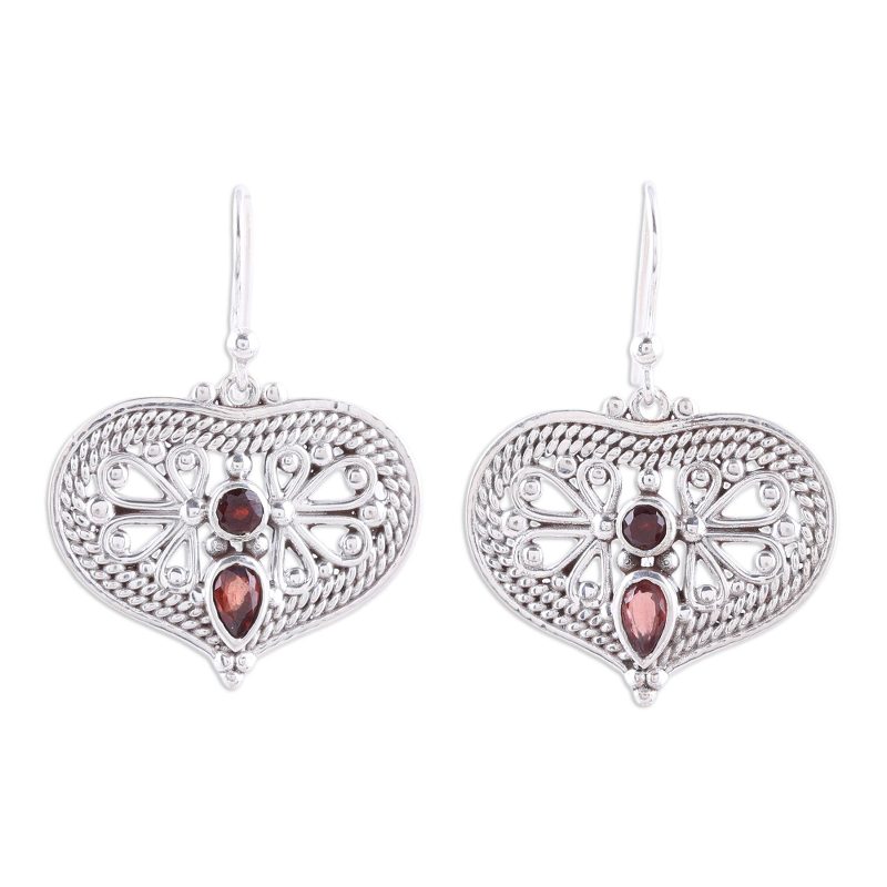 Backed by our 100% Happiness GuaranteeHandcrafted rope and flower motifs swirl within each of these lovely dangle earrings. Two glittering garnets add a pop of red to the polished sheen of sterling silver. Indian artisan Parul designs the heart-shaped earrings, selecting gemstones totaling 1.9 carats.