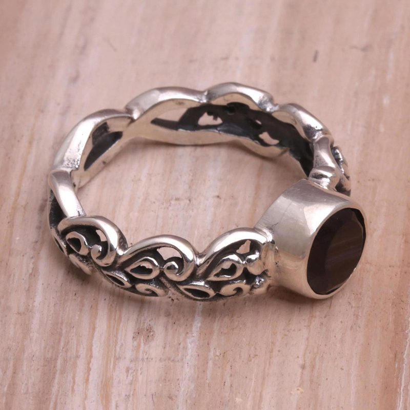 Creeping vines that circle the finger are handcrafted in sterling silver by Balinese artisans. A combination of contrasting finishes makes this ring a wonder to behold, featuring a single stone of faceted garnet. Putu Putri presents this dazzling single stone ring.