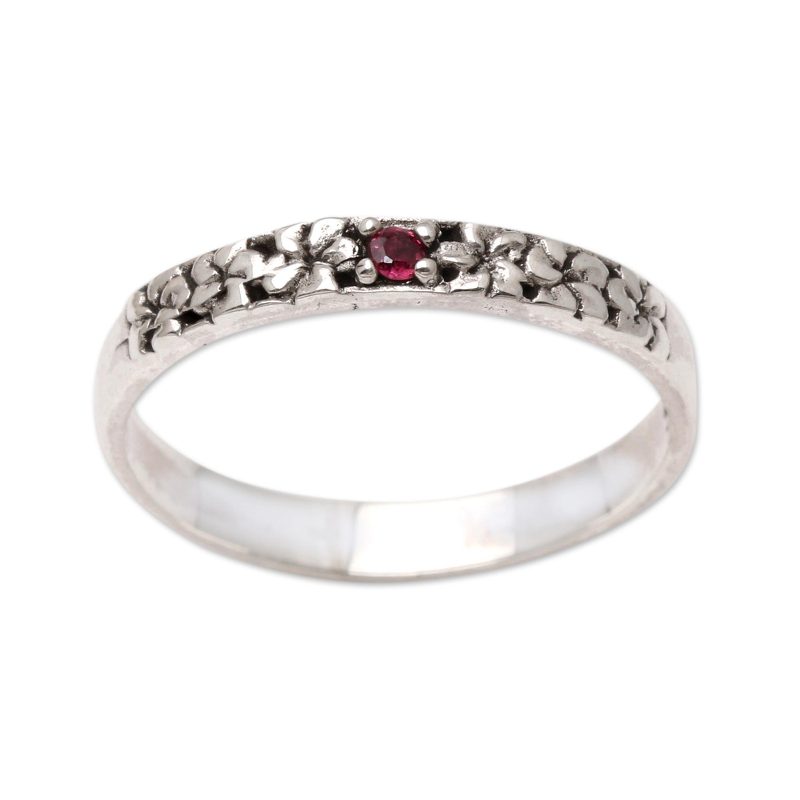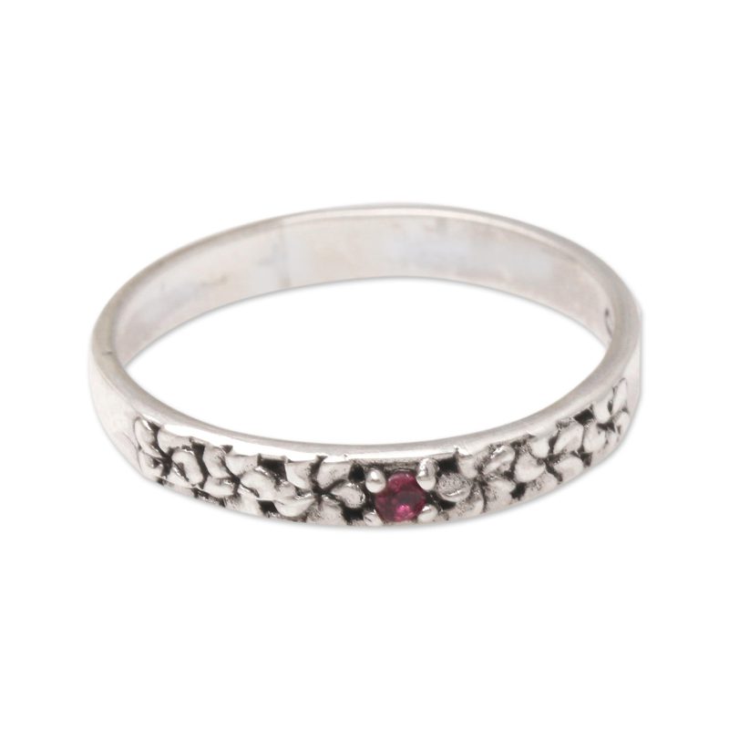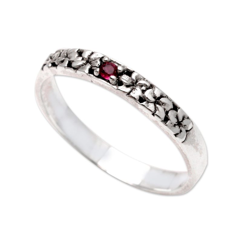 Backed by our 100% Happiness GuaranteeA petite red gemstone shines at the center of Wayan Lasti's delicate ring. The Balinese artisan crafts the ring from a simple band of sterling silver, while oxidized frangipani flowers add textural interest. A round garnet gem in a decorative prong setting gives the ring a subtle sparkle.